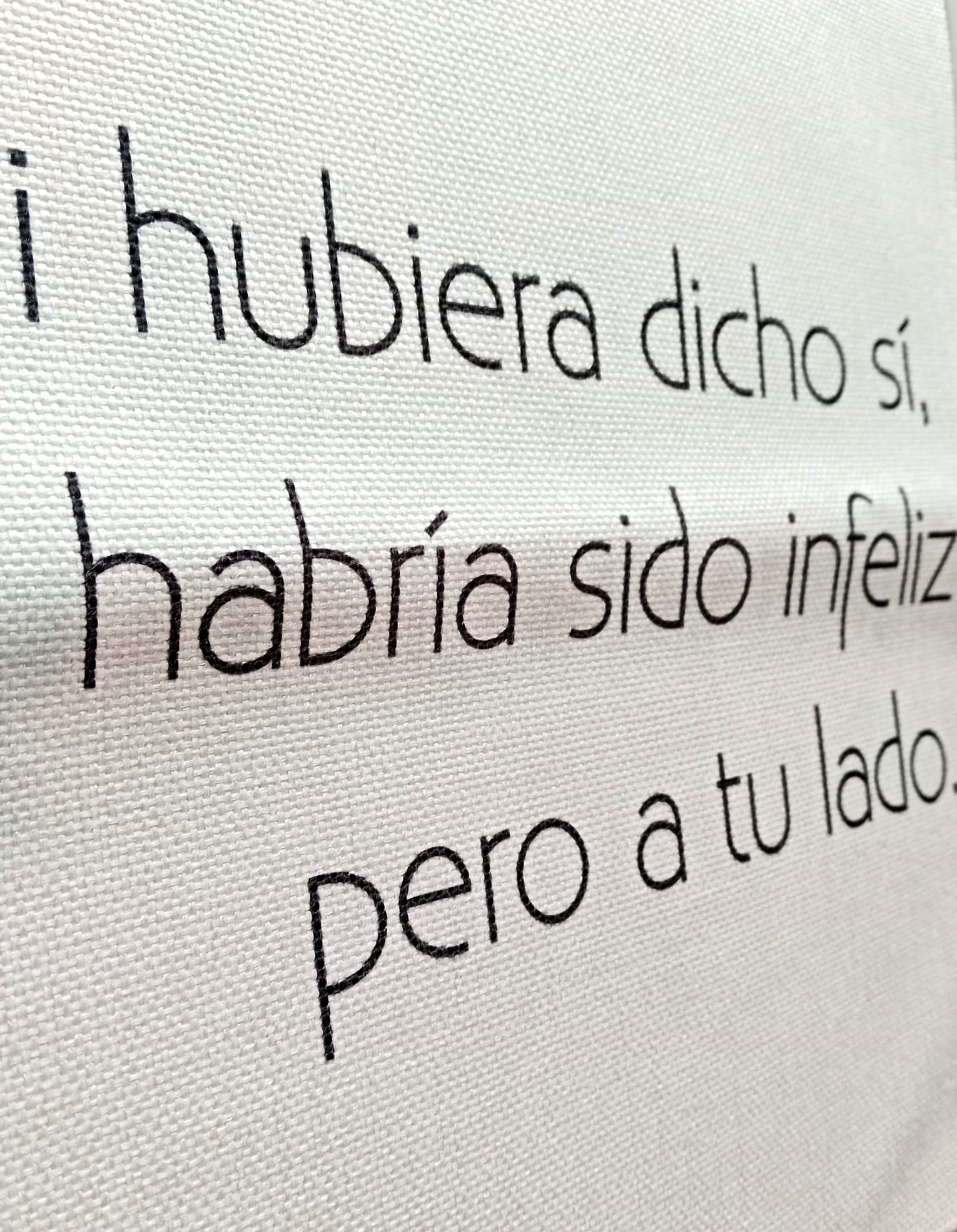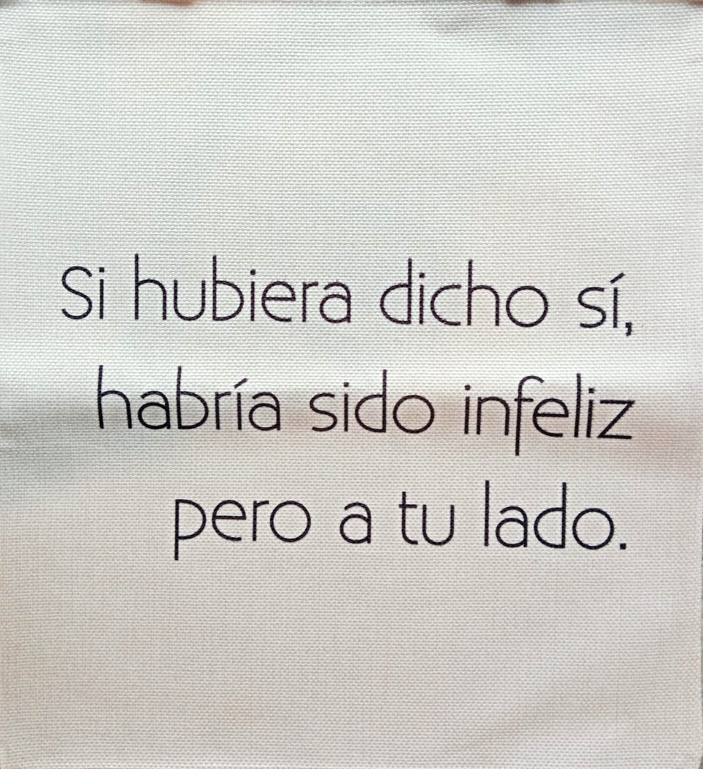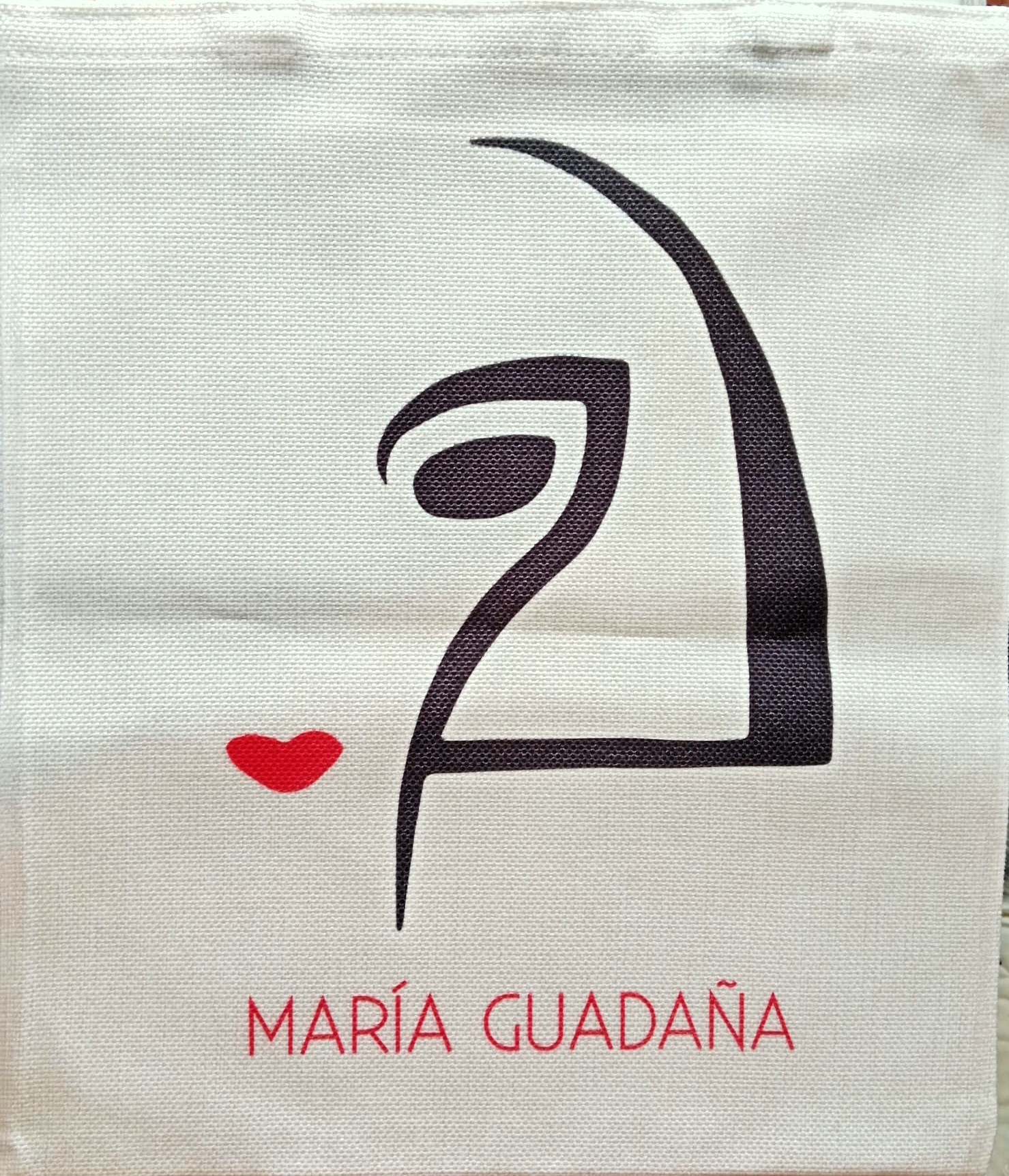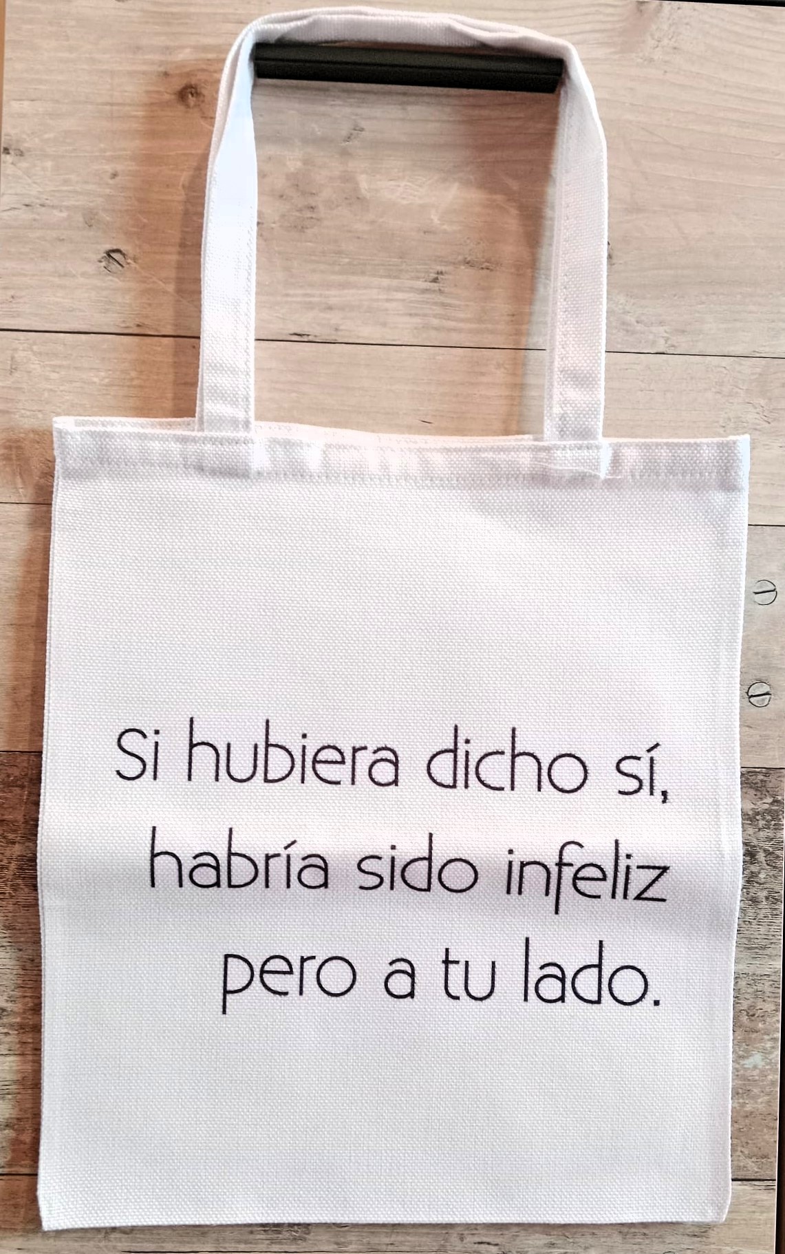 Bolsa para la compra, para el yoga, para llevar el vino a la cena con tus amigas. Por un lado impresa con el logo de María Guadaña, por el otro, el texto "Si hubiera dicho sí habría sido infeliz pero a tu lado", de la canción La No Novia.
